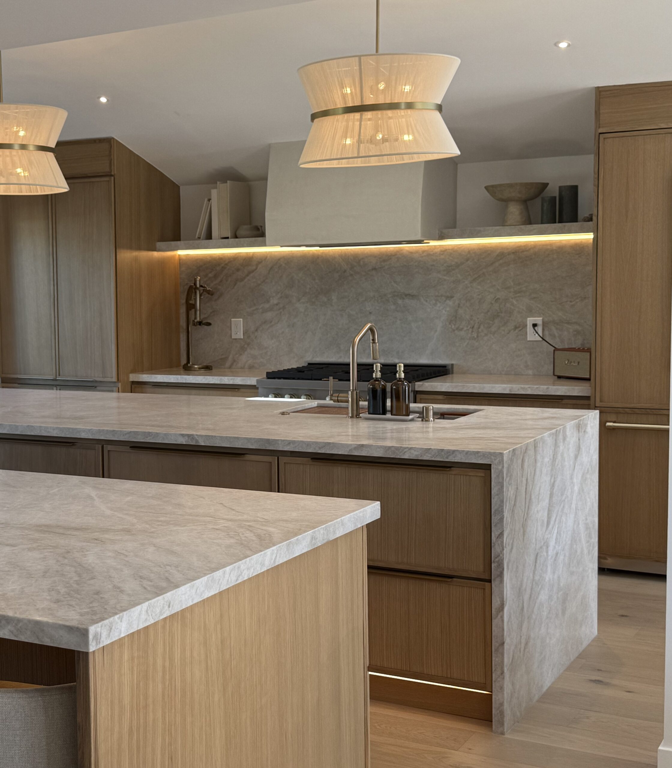 Taj Mahal quartzite wrapped the countertops and island in a creamy, luminous surface. Its delicate veining mirrors the softness of the oak, creating a seamless dialogue between wood and stone.