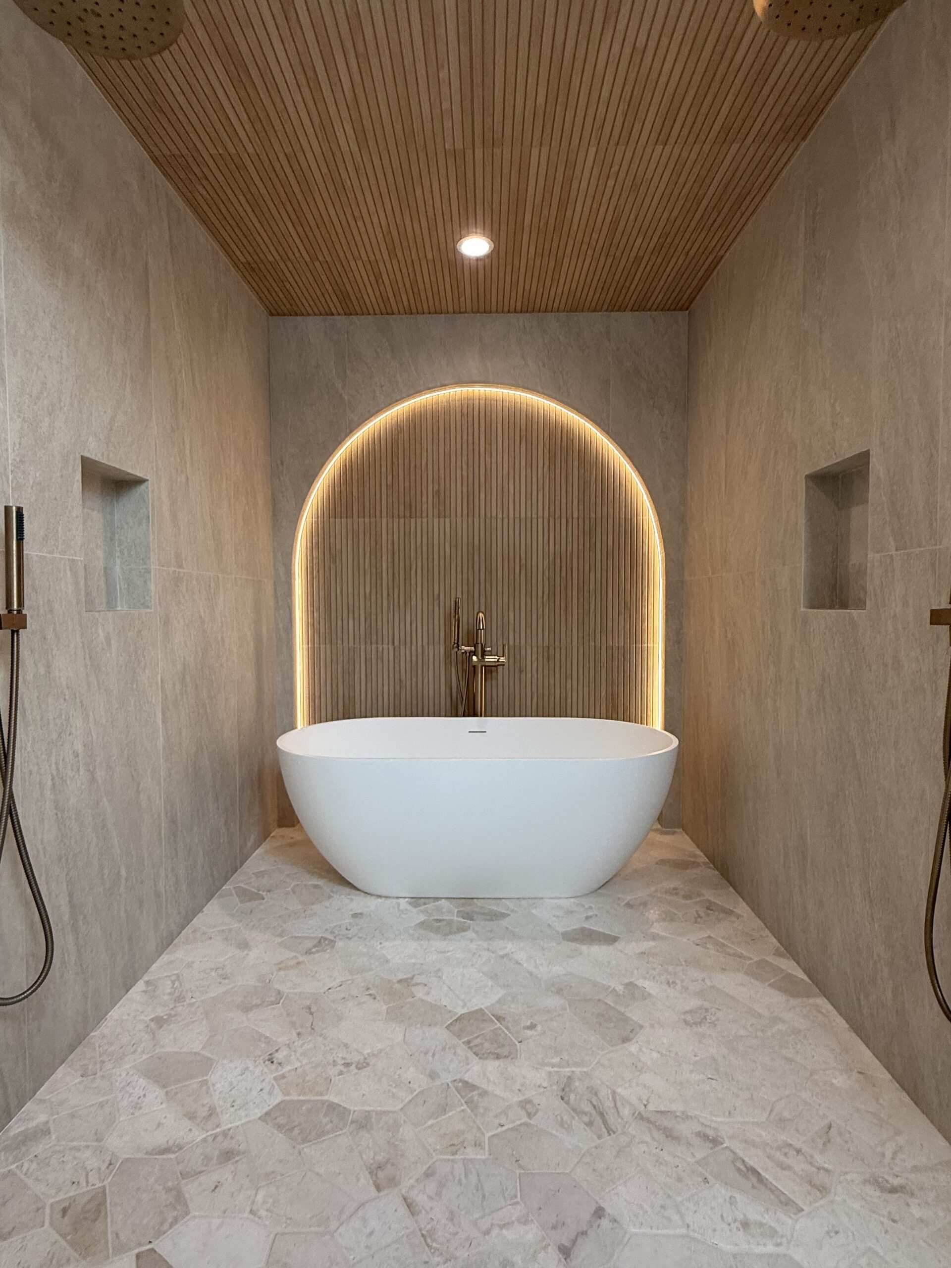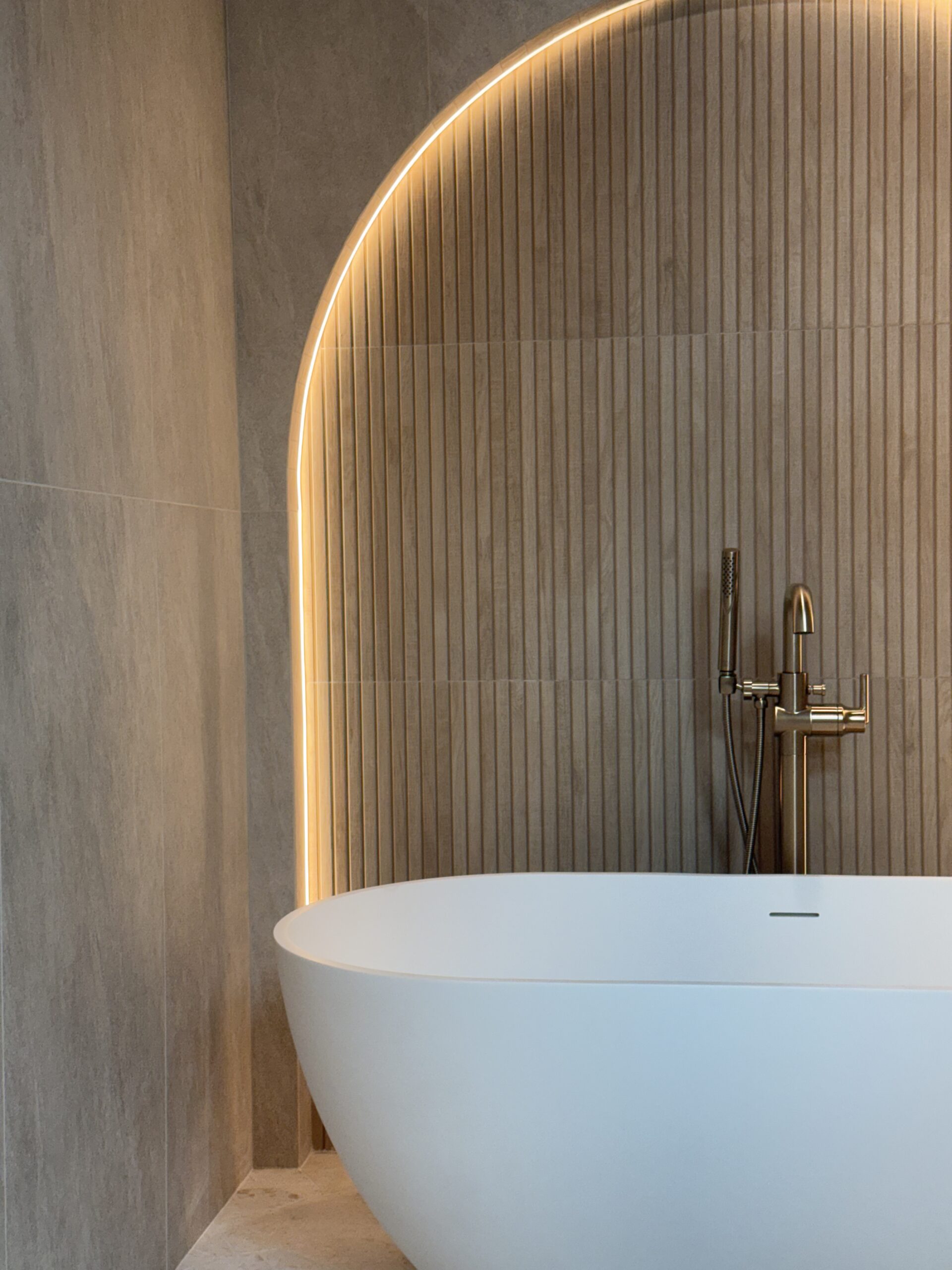 At its center sits a freestanding soaking tub, framed within a softly illuminated arch. Behind it, vertical fluted tile adds texture without overwhelming the eye. Concealed LED lighting traces the curve, casting a warm halo around the niche.