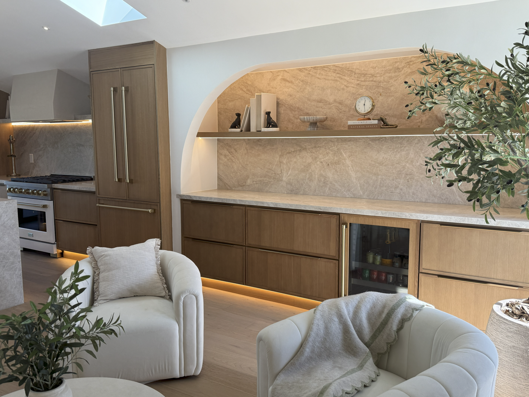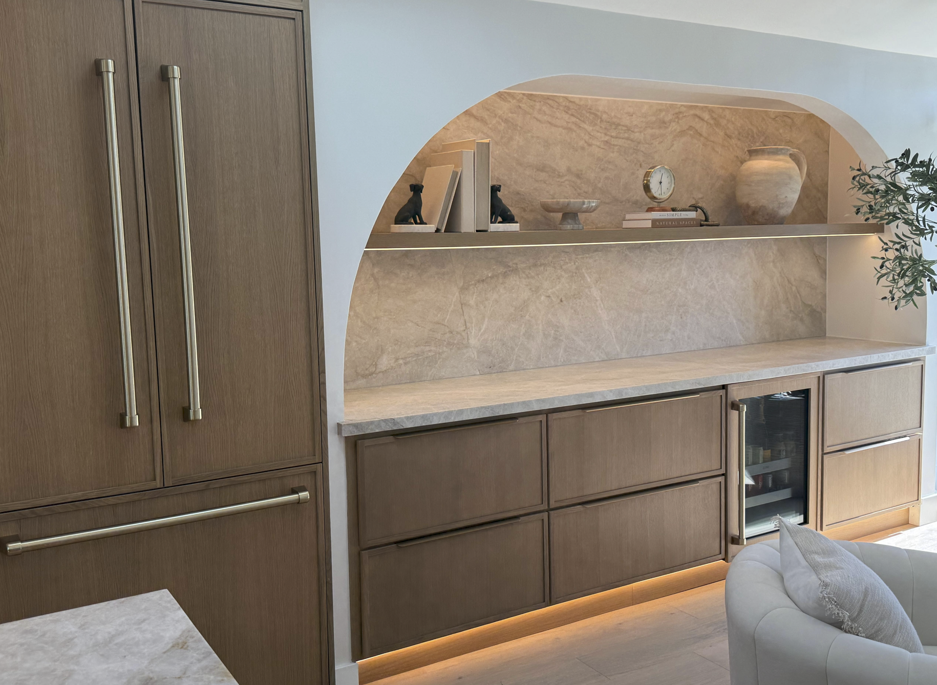 Slim Oak cabinetry continues here, paired again with Taj Mahal leathered stone. The material repetition anchors the design while the arch introduces personality.