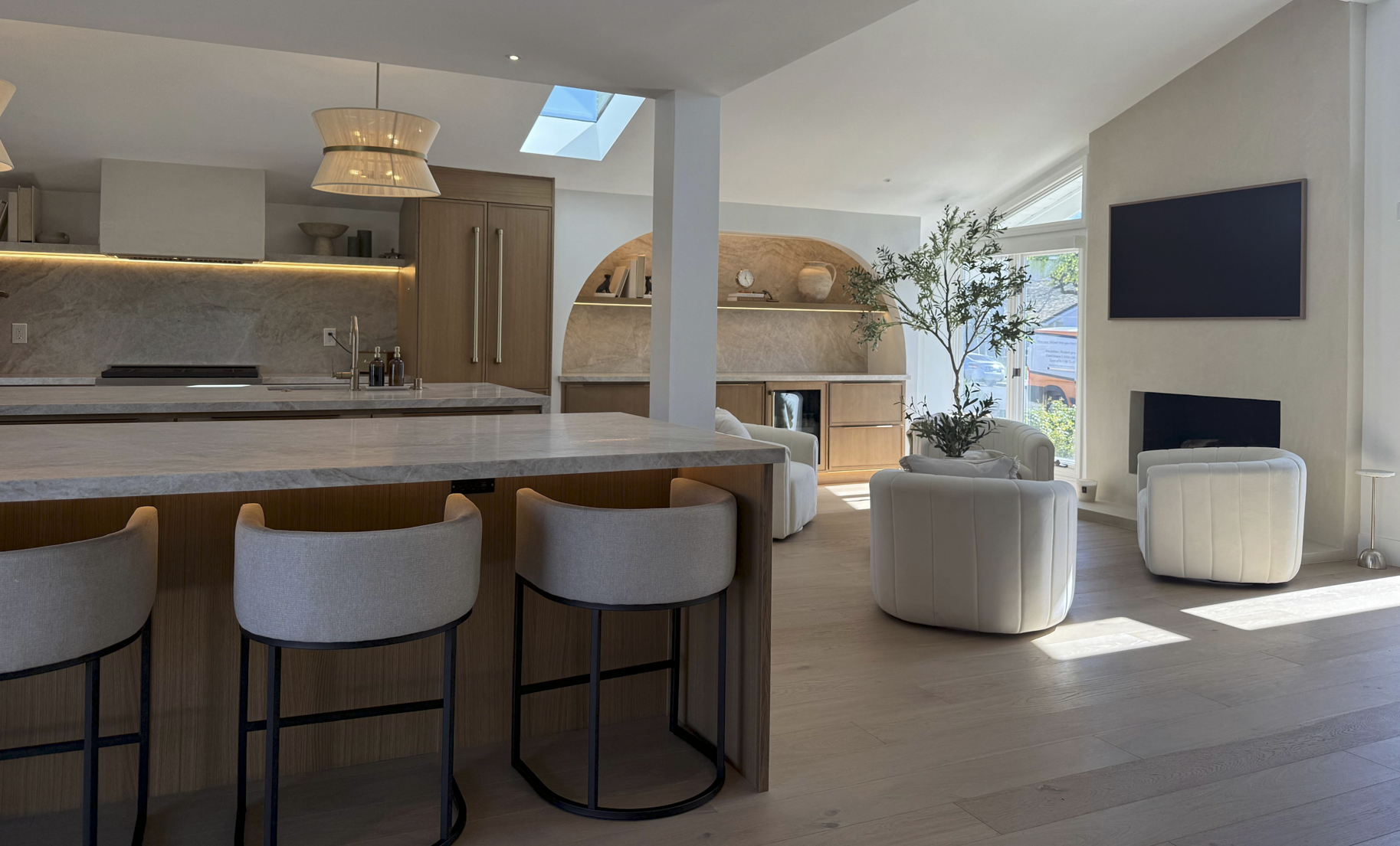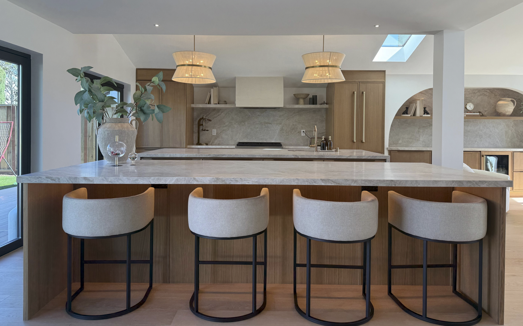 Custom built-ins echo the arched language established in the kitchen. Warm wood tones are layered against neutral walls tones that shift gently with the light.