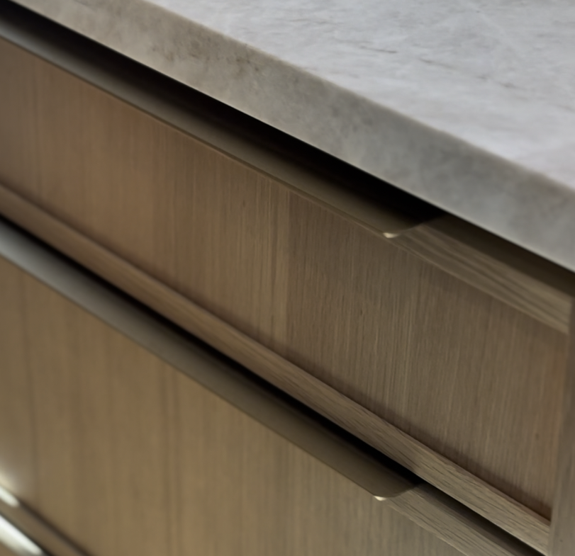 Slim Oak cabinetry by Elite Stone Group introduced vertical grain texture — warm, organic, and quietly modern. The flat slab doors kept the composition clean, allowing the material itself to take center stage.