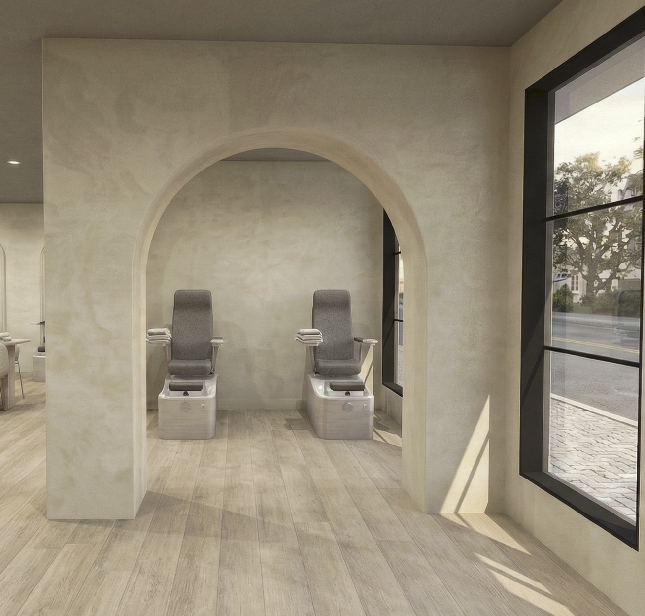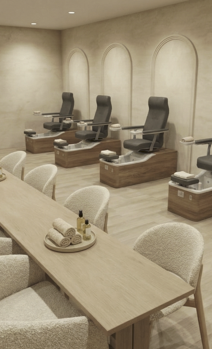 The vision for this Pasadena nail salon was clear from the start: create a clean, warm, and welcoming environment that stands apart from traditional nail salons.