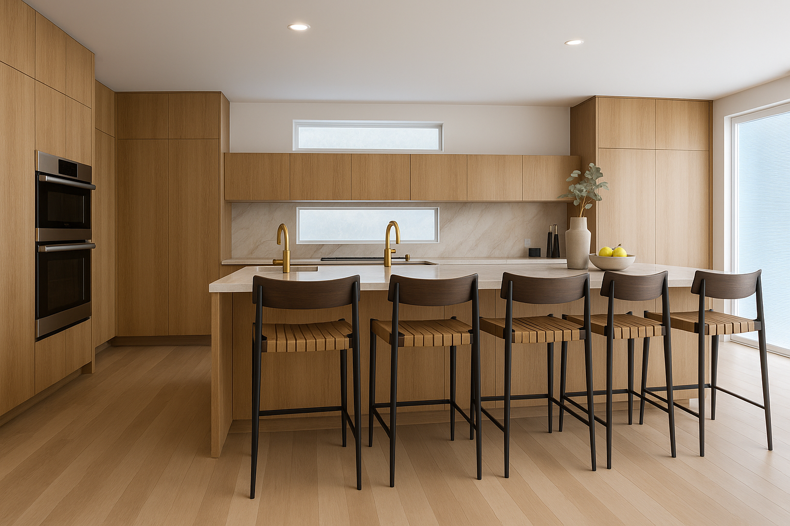 This kitchen was designed with a seamless, modern aesthetic in mind. The cabinetry is fully custom, crafted in warm wood tones with clean slab fronts for a streamlined look. Every detail was tailored for both functionality and design — from the sleek integrated handles to the flush cabinet alignment.